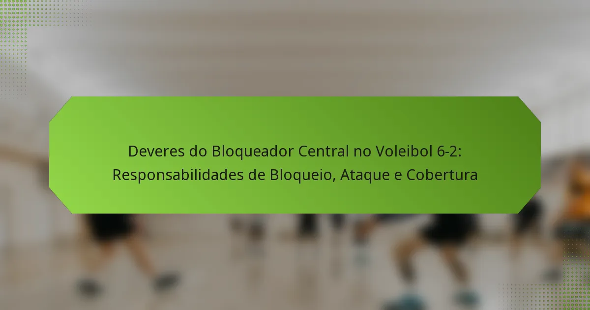 O bloqueador central num sistema de voleibol 6-2 desempenha um papel crucial tanto no ataque como na defesa, focando principalmente em responsabilidades de bloqueio, ataque e cobertura. A sua posição requer uma tomada de decisão rápida, comunicação eficaz e um posicionamento forte para apoiar a equipa durante as jogadas.